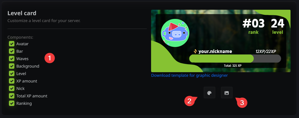 You can personalize how the level cards look on your server. Use ready-made components (1), choose a primary theme color (2), and upload a background image (3). All changes are displayed in real-time in the preview panel.