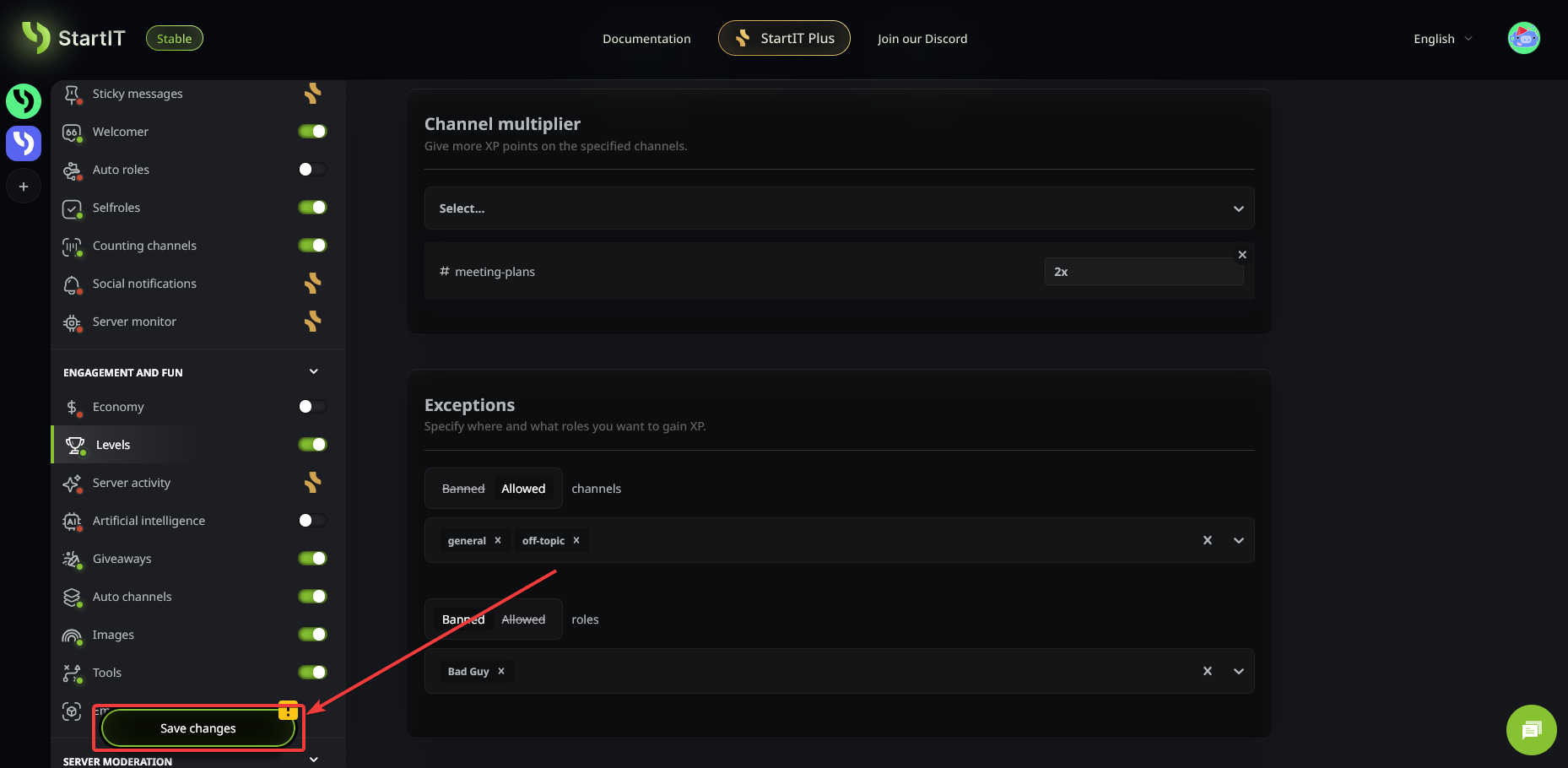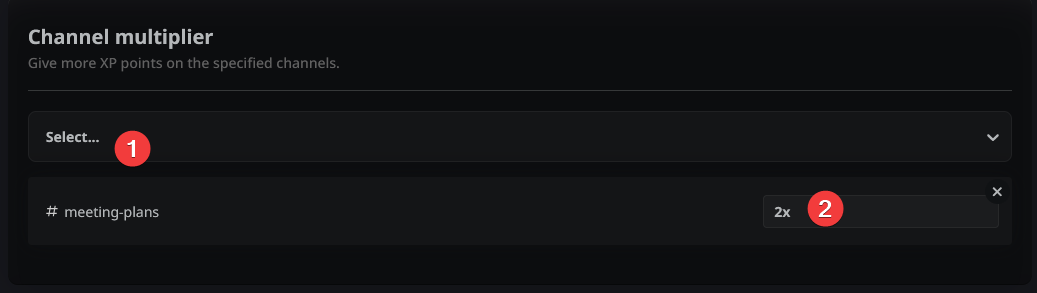 You can encourage activity in specific areas (like a #debate or #creative channel) by selecting the channel (1) and setting its multiplier (2).