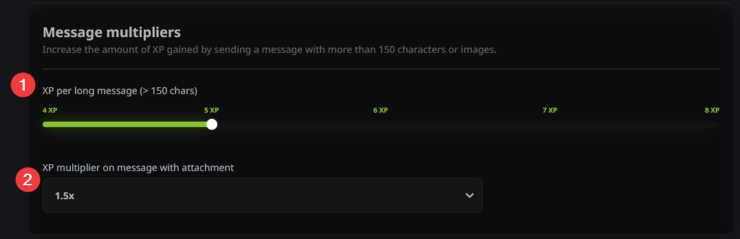 This is where you decide how fast your users progress. You can set the amount of XP earned for sending messages (1) or for spending time in voice channels (2).