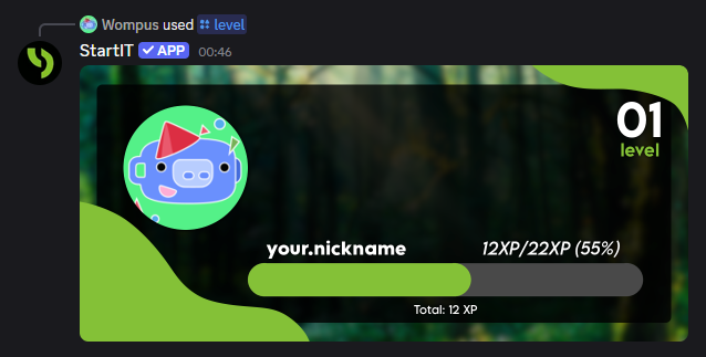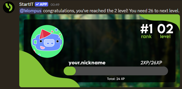 - Anti-spam protection: The bot only awards XP for one message every ~10 seconds per user.