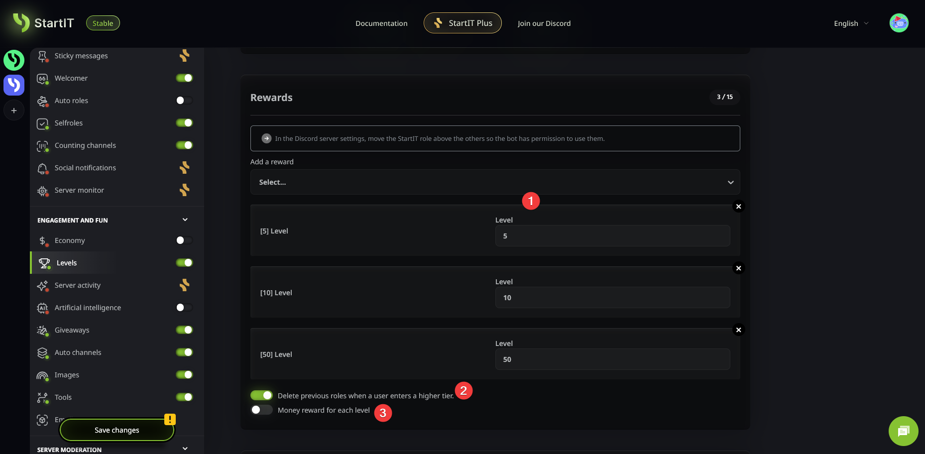 The role name will appear on the left, and the required level on the right. You can also configure the bot to remove the previous, lower-tier role (2) when a new one is earned. If you have the Economy plugin enabled, you can even set up automated cash rewards (3).