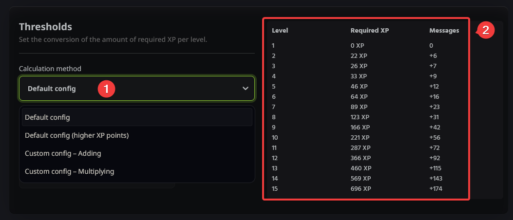 - The table on the right (2) shows exactly how much XP and how many messages are required for each level. This table updates in real-time based on your plugin settings.