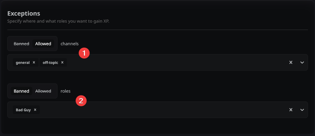 - Banned (The "Everything Except" Mode): Best if you want XP active everywhere, but want to exclude a few things—like a "Muted" role or a "Spam" channel.