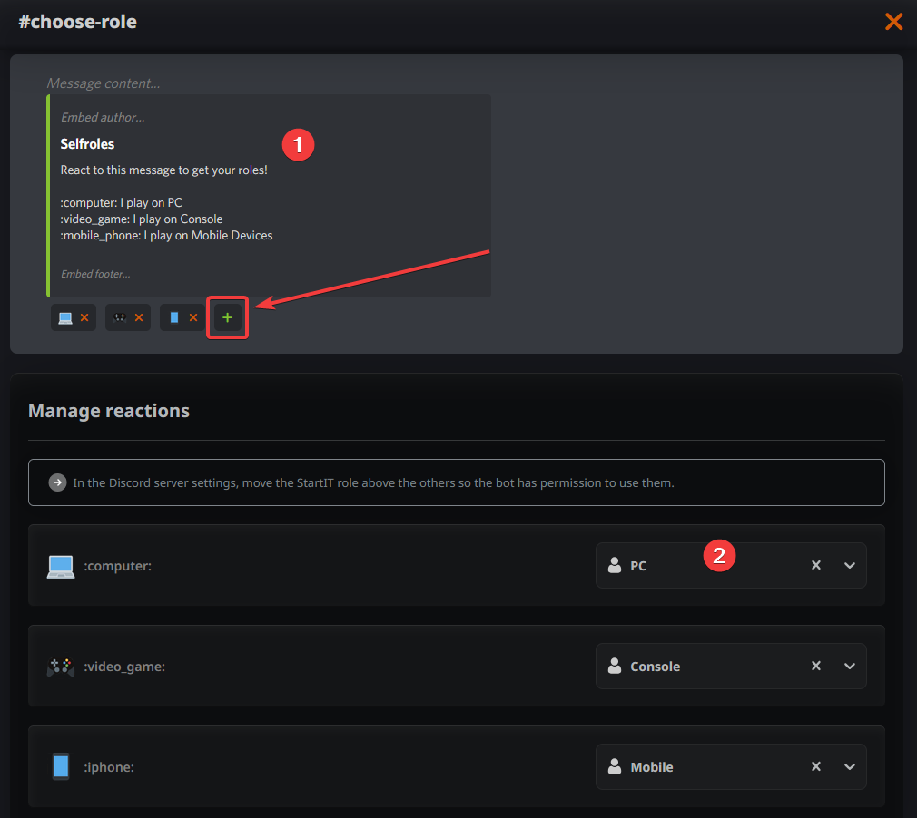 Now, it’s time to design the message. Describe the panel clearly so users know which reaction grants which role. Add your chosen emojis by clicking the "+" button (1). Below that, map each emoji to the corresponding role using the dropdown menus (2).