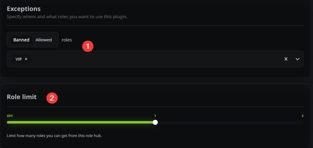 You can fine-tune the experience by deciding which roles are allowed (or forbidden) from using this specific panel (1). Additionally, you can limit how many roles a user can pick from this set at once (2).