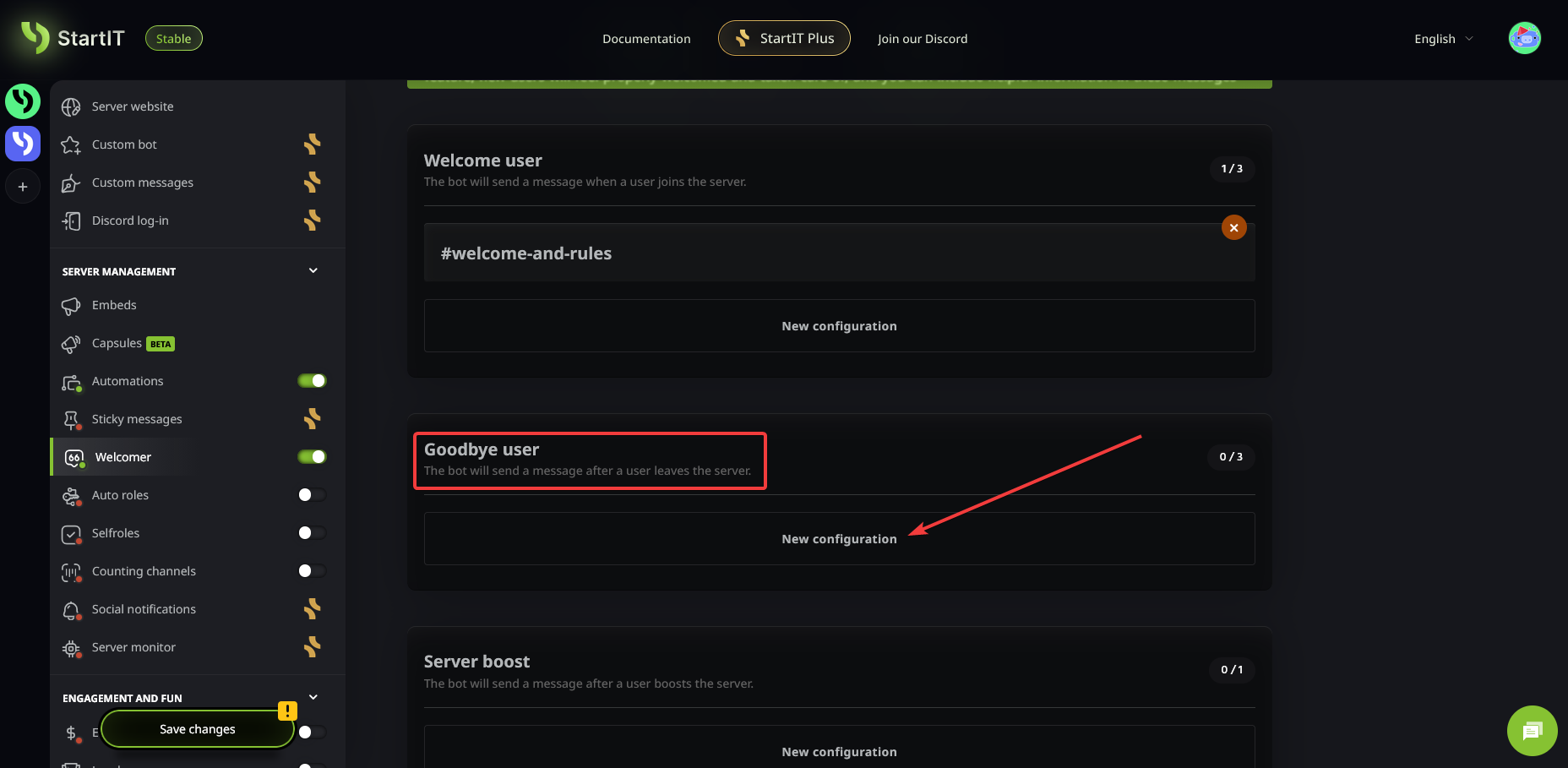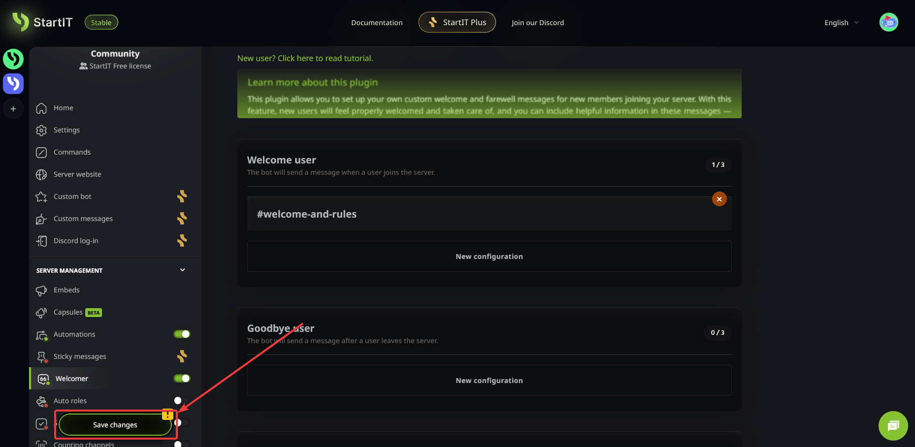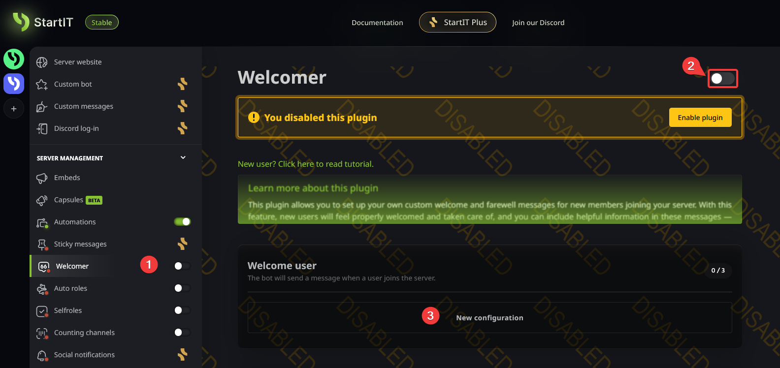 Open the Plugin: Navigate to the "Welcomer" plugin, enable it, and click on "New configuration"